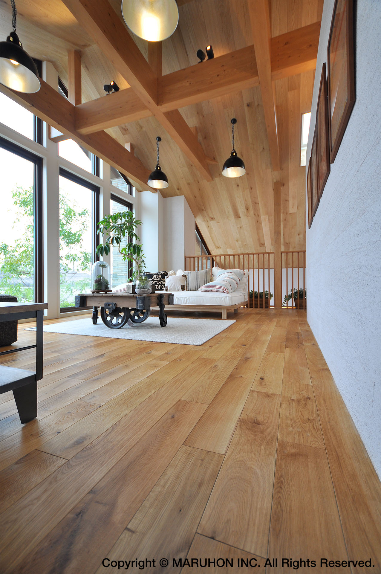 ヨーロピアンオークの木目にホワイトのオイルステインを擦り込んだ、アンティーク調の床暖房対応挽板フローリング。同じくホワイトウォッシュ塗装で仕上げたホワイトオークの階段材は、空間によく溶け込んでいます。