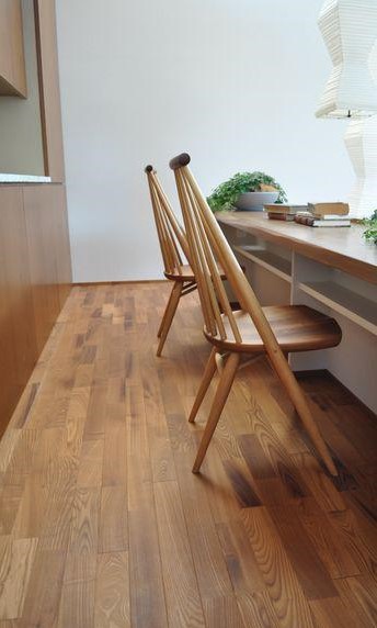 ヨーロピアンオークの木目に白い塗料を擦り込んだオイルホワイトウォッシュ仕上げのフローリング。ワイルドなオーク材もほんのり優しい雰囲気になります。ベンガラ塗装で仕上げたカウンターが程よくアクセントになっています。