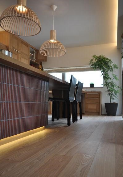 木をふんだんに使ったご物件。200mm巾のヨーロピアンオークのフローリングは、節や木目がのびのびと入りダイナミックな印象になります。床に合わせてテーブルやルーバー天井もカスタムメイドで作製しています。