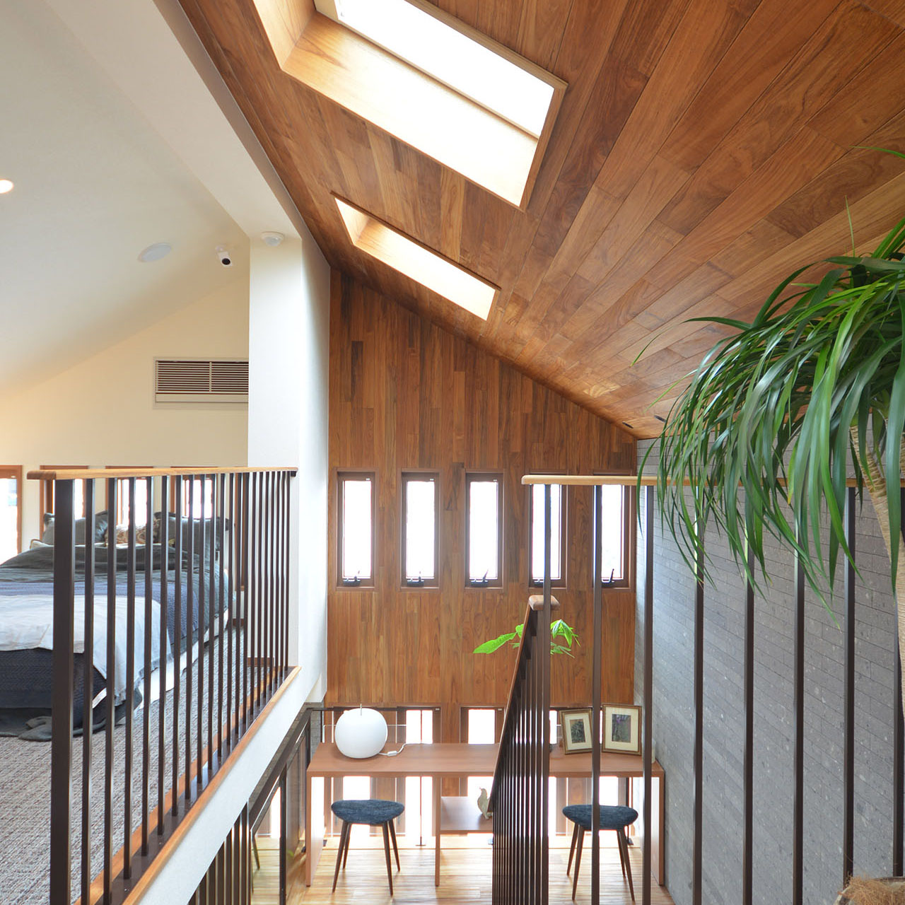 天井と踊り場の壁面にチークをご採用いただいた事例です。チークならではの重厚感が楽しめる無垢パネリングは、グリーンとの相性も抜群。 さまざまな長さを張り上げる乱尺タイプのパネリングは、無垢ならではの素材感もお楽しみいただけます。
