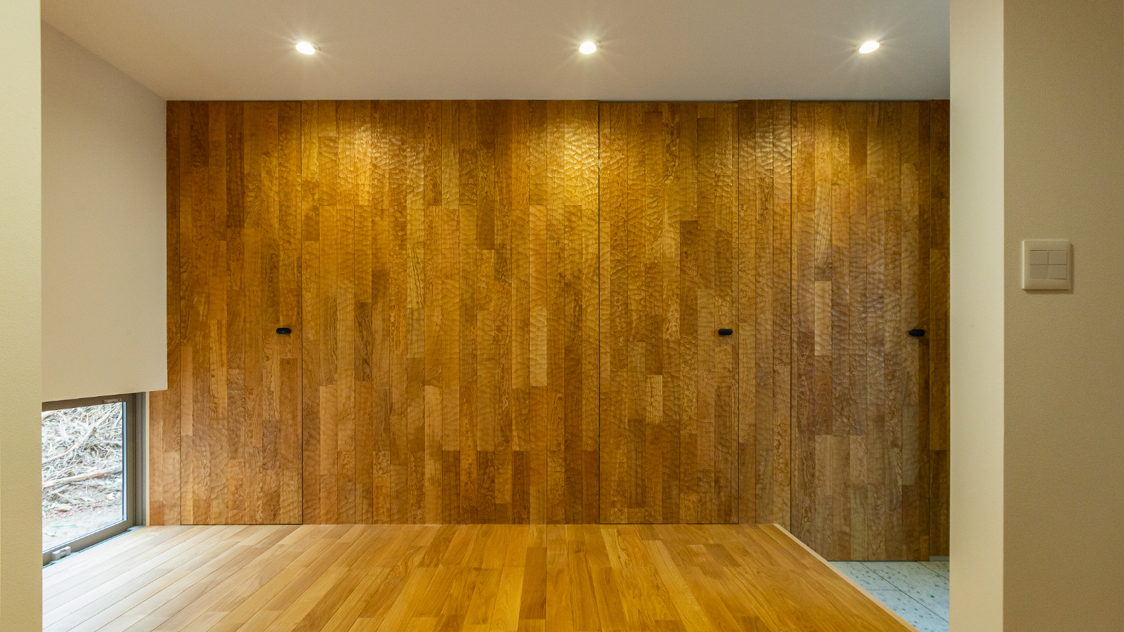 無垢パネリングは2m~4mの長尺物が一般的な仕様であるのに対し、無垢フローリング長さの仕様は、乱尺や、長尺であってもソリッドユニタイプのものが多くなります。そのため、張り上げた際長手方向に継ぎ手が出て、一本通しでは張りにくいことが注意点として挙げられます。材の選定段階で、長さの仕様を確認する必要があります。■周辺部材との納まり