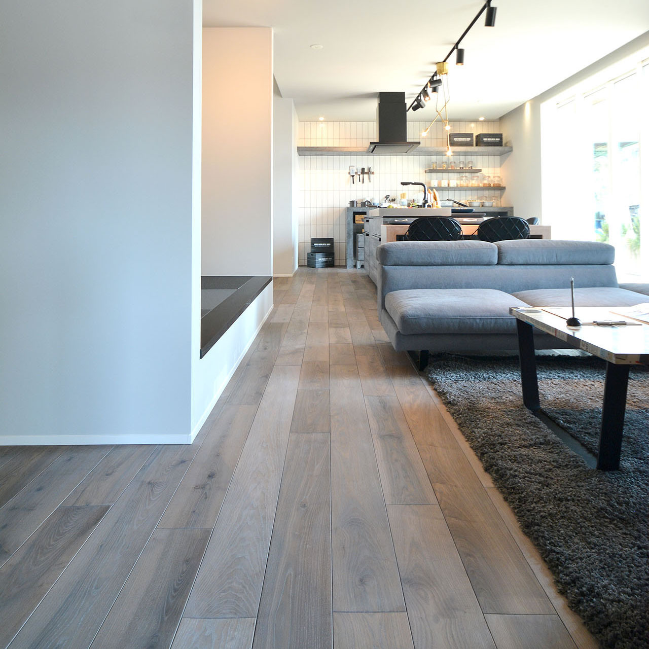 ヨーロピアンアッシュの草木染フローリング。3色あるシコンの中でも明度の高く、グレイッシュな印象に。無垢材ならではの有機的な色むらを楽しむことができます。玄関框も草木染で染め上げています。