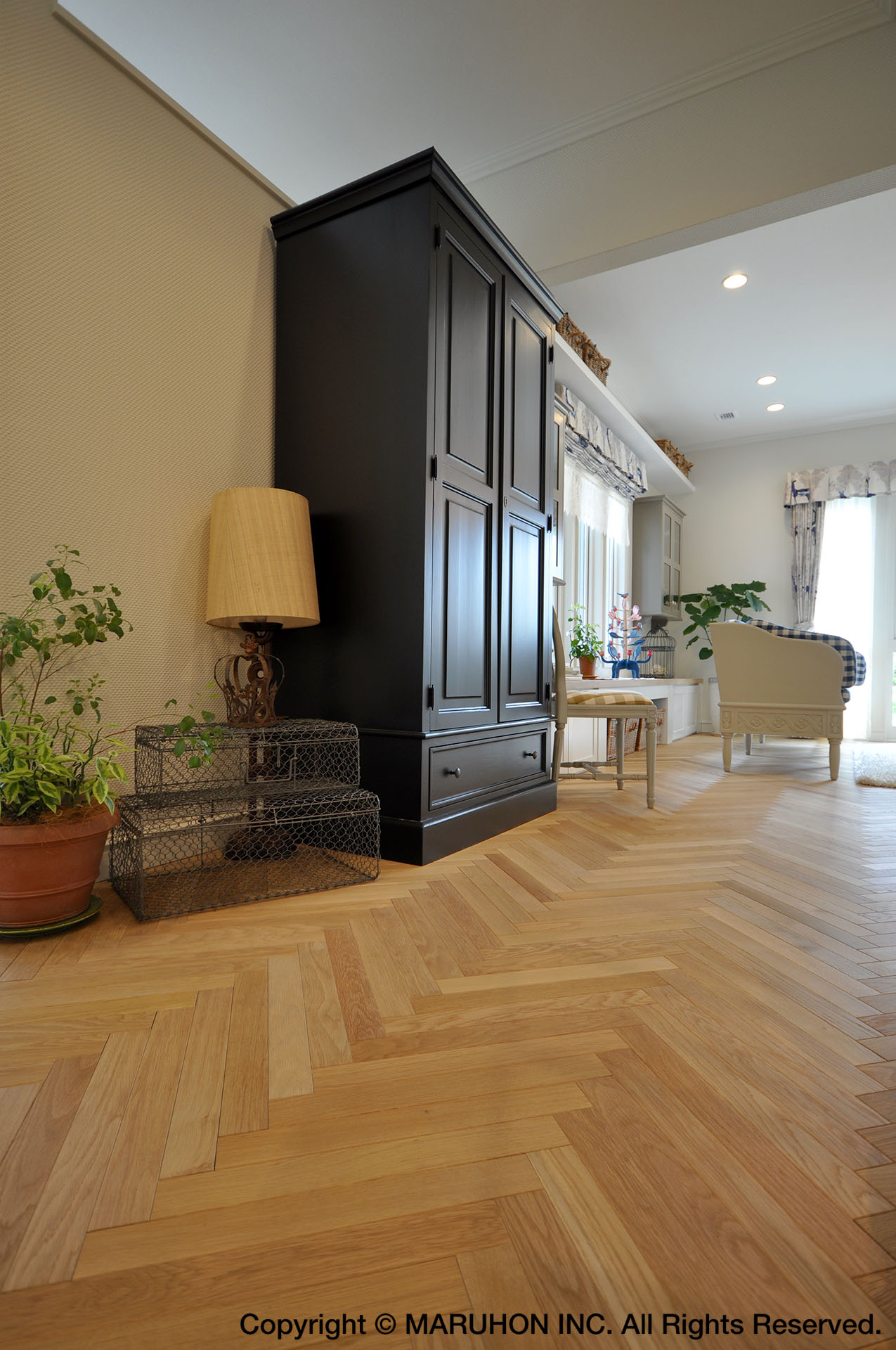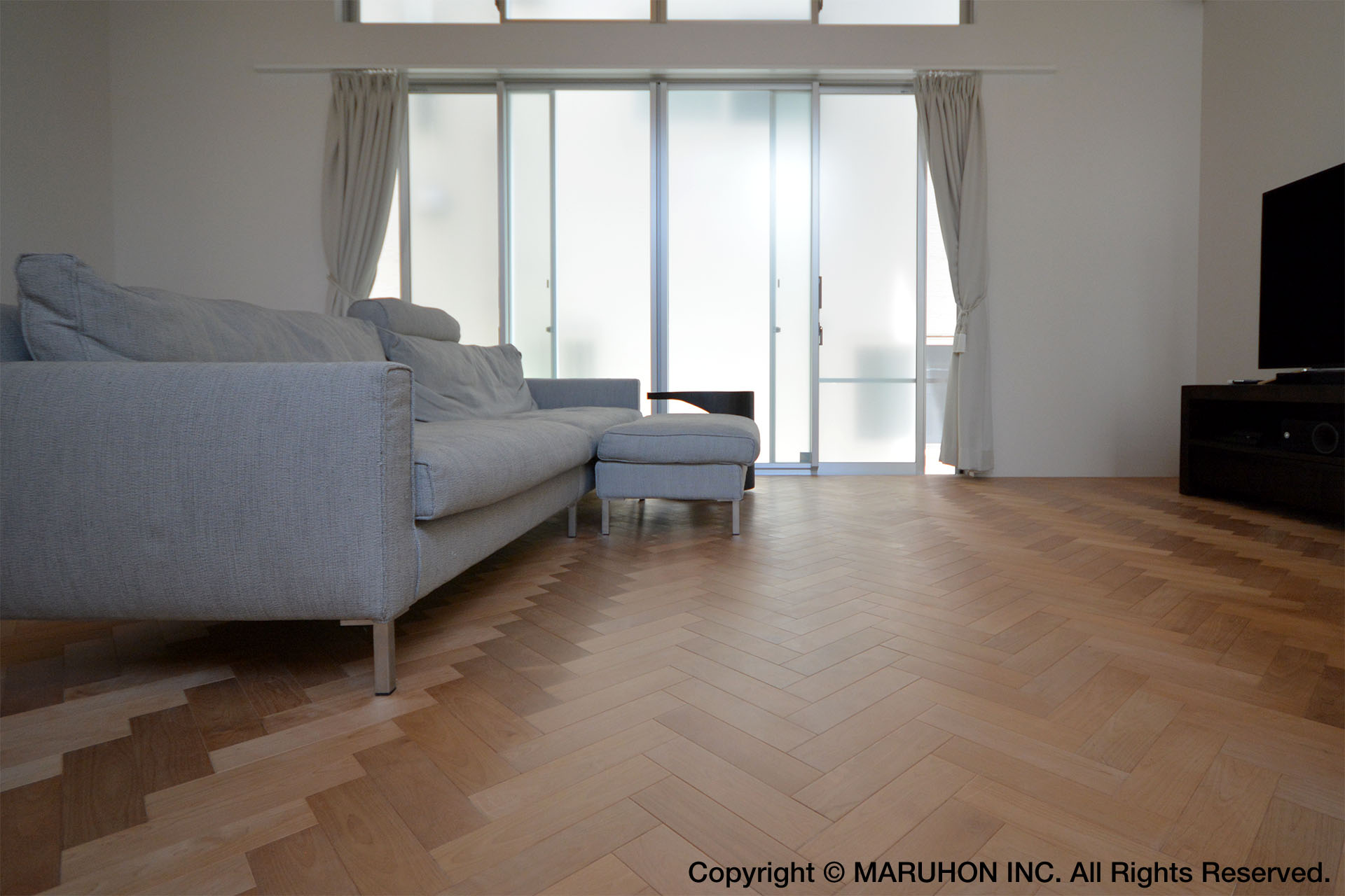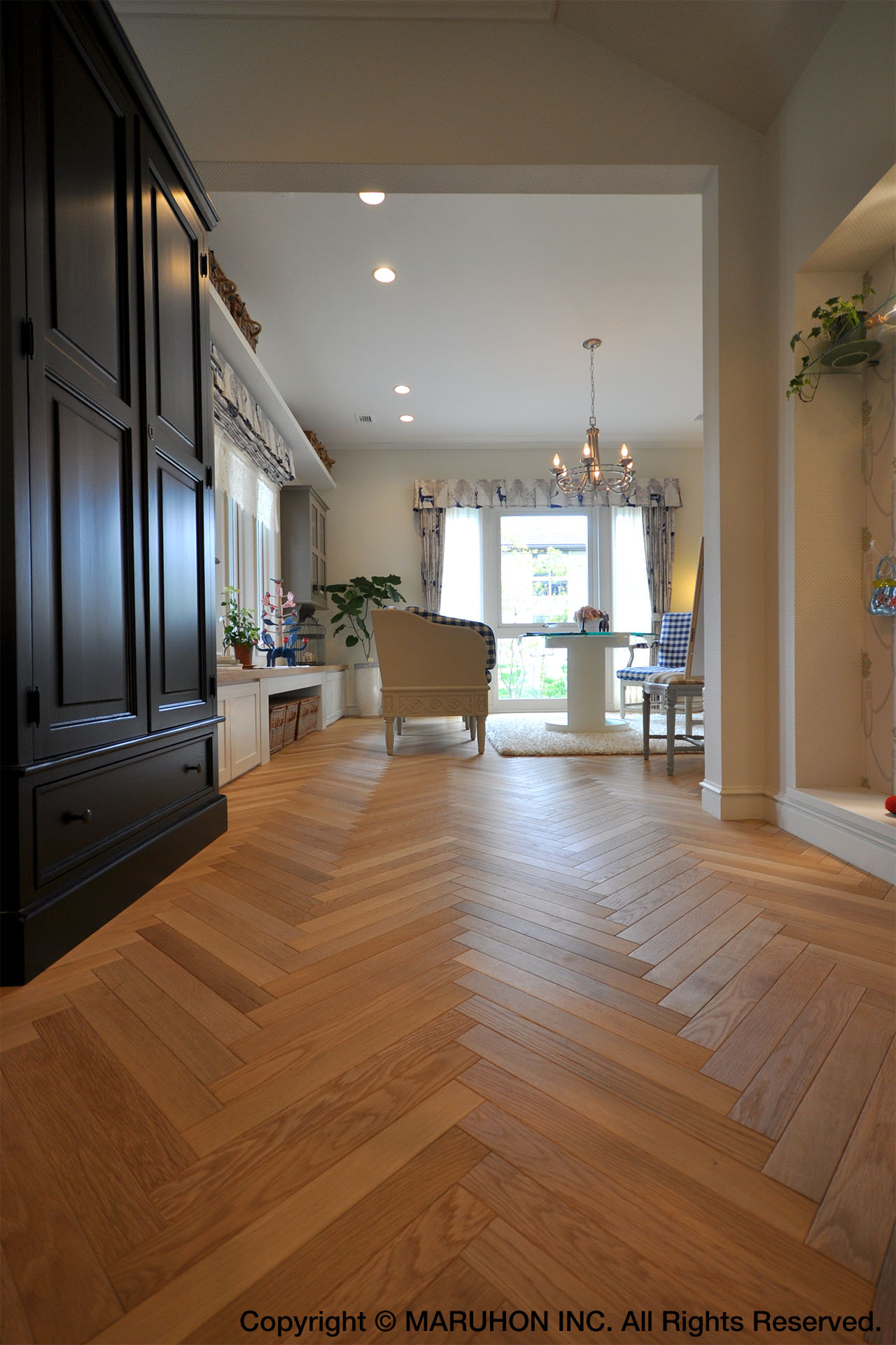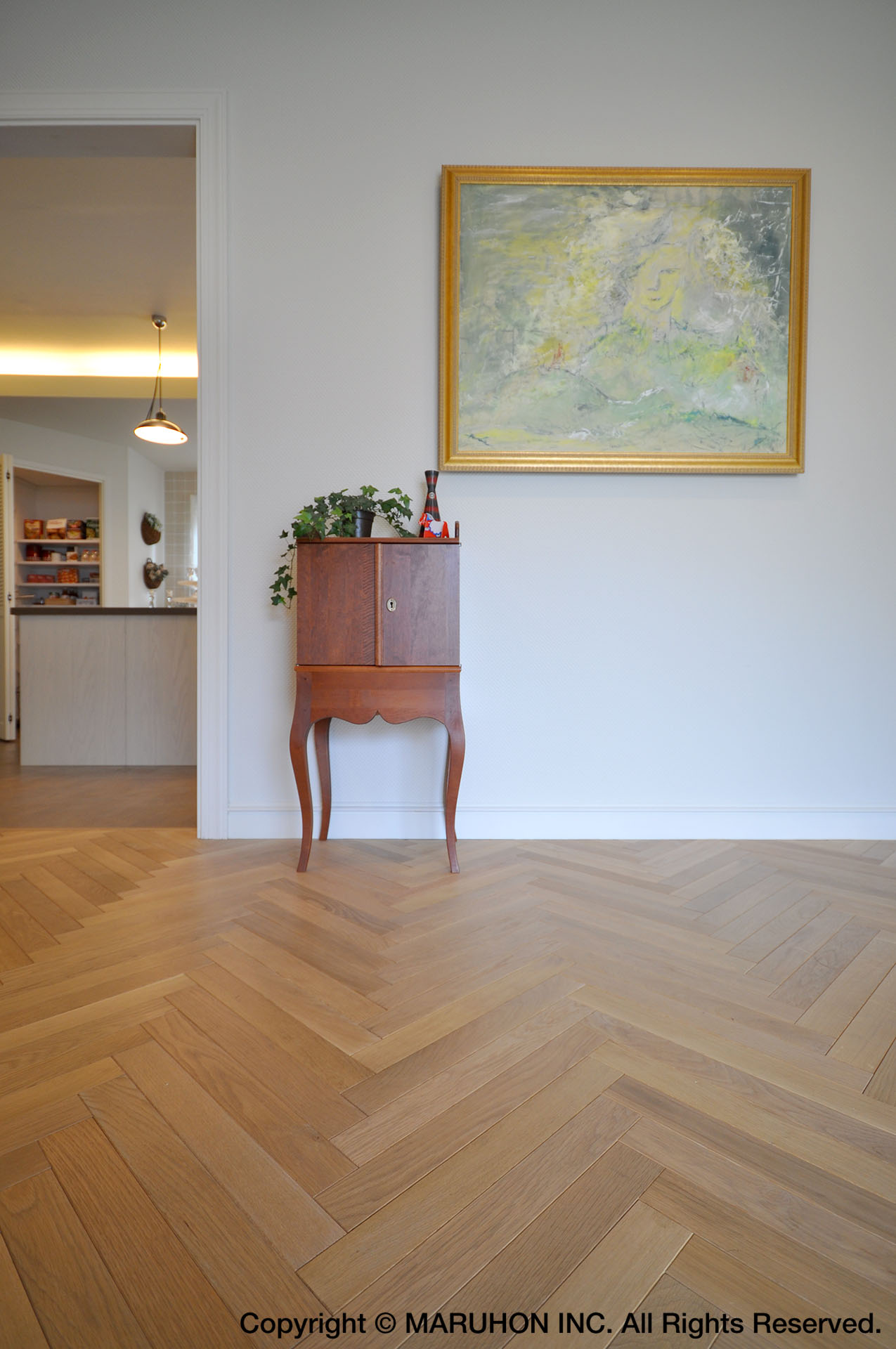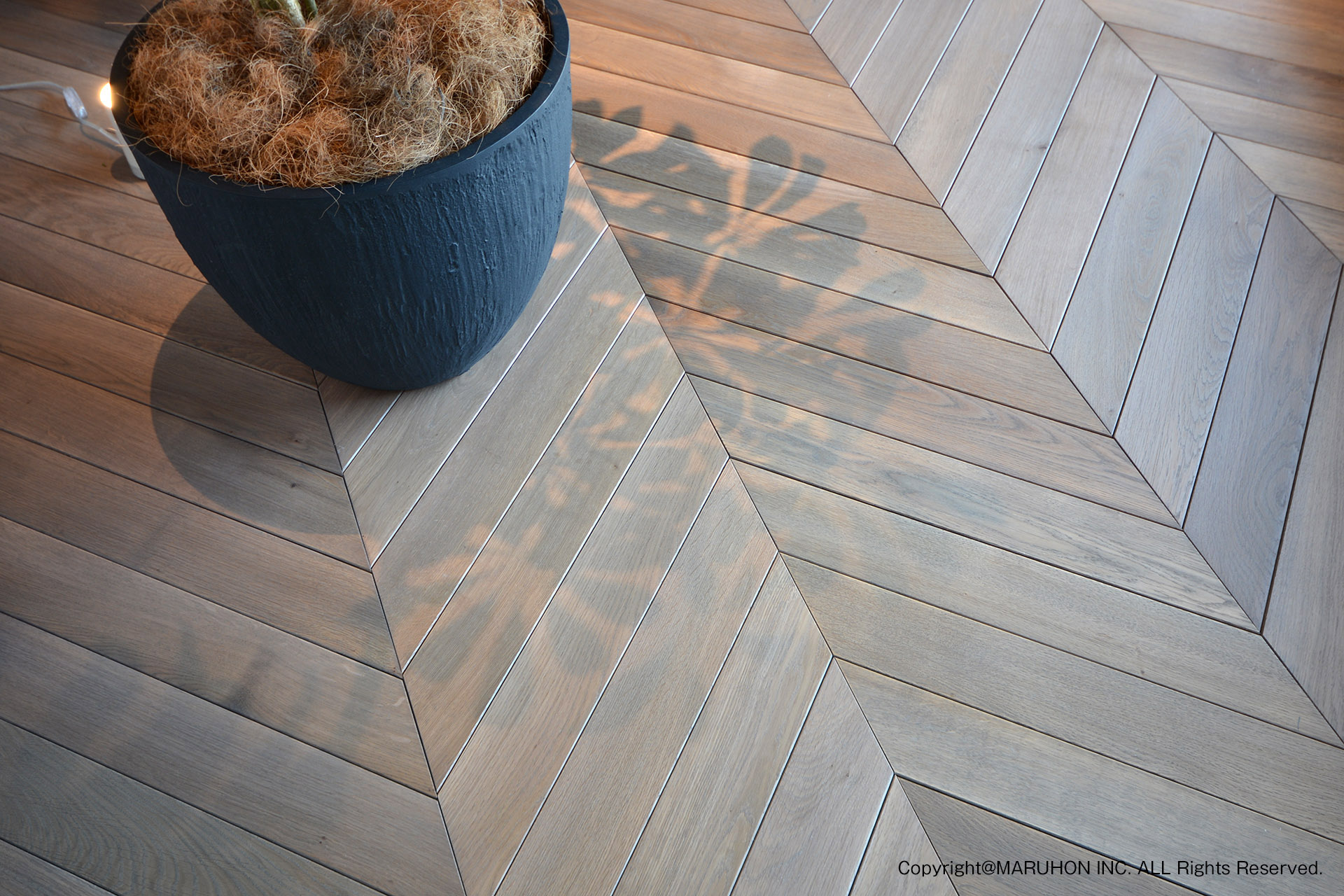 商品名ヨーロピアンオーク 床暖房対応 フレンチヘリンボーン 挽板フローリング 121.2mm巾 右用