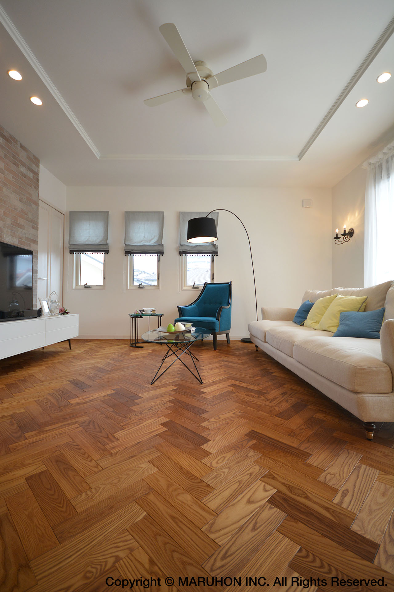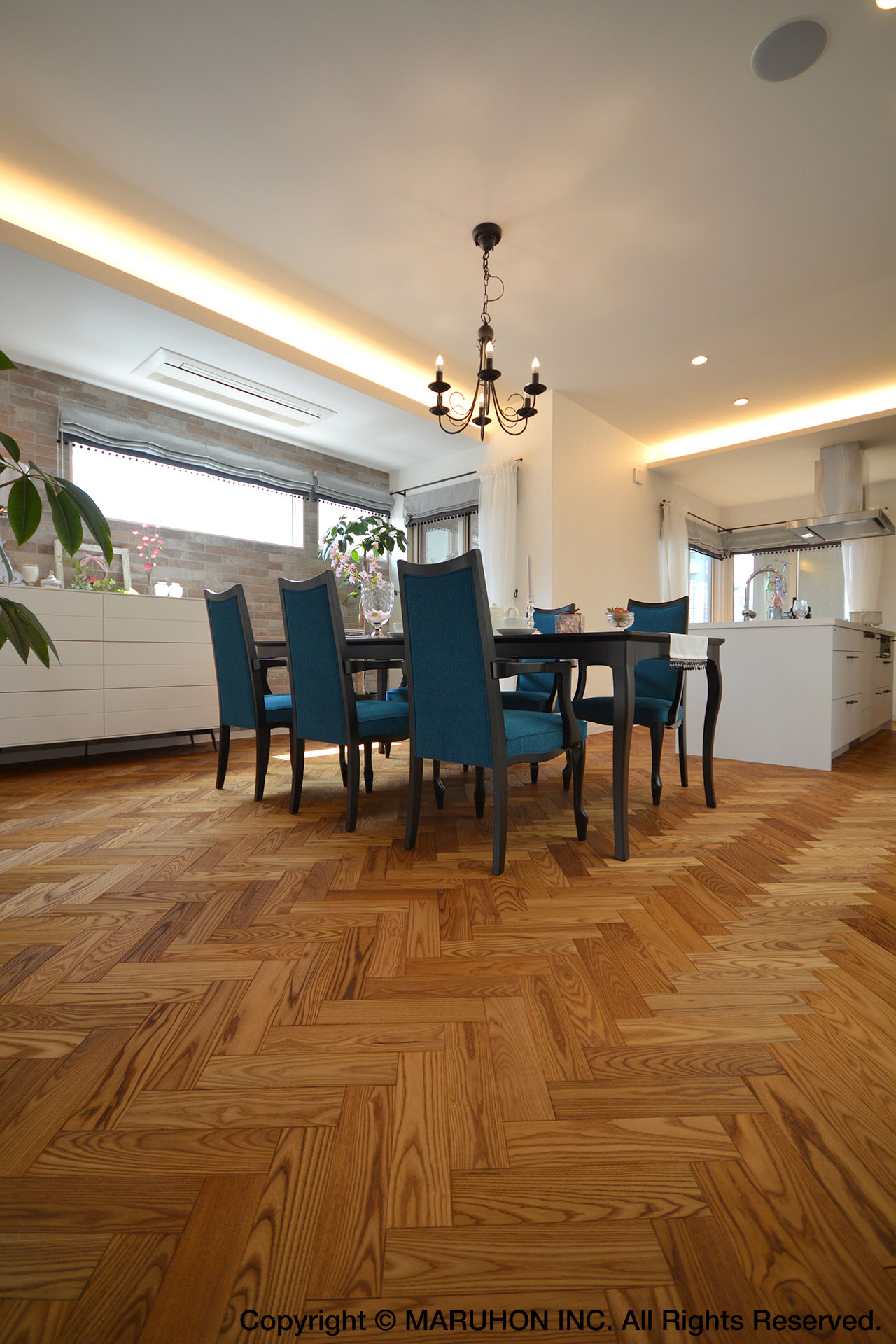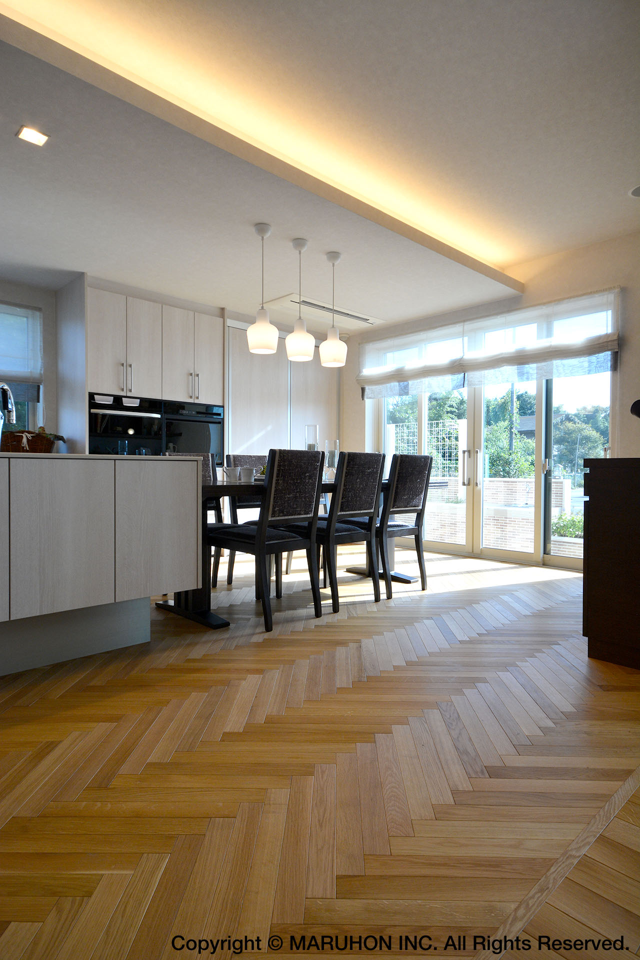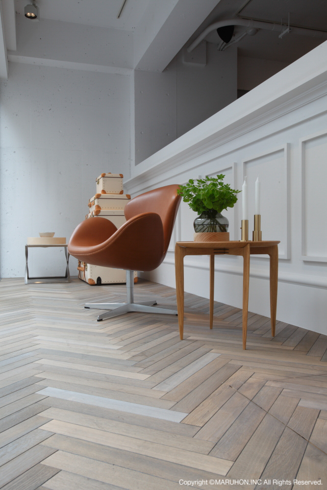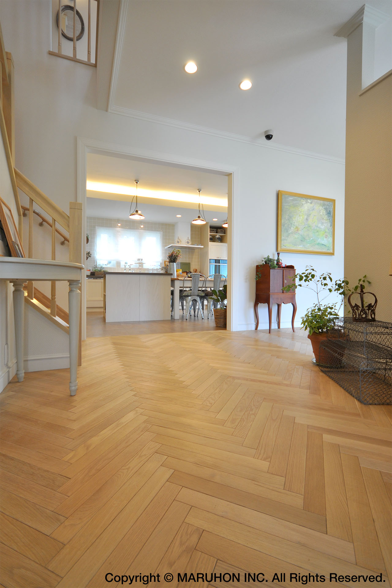 商品名ヨーロピアンオーク 床暖房対応 フレンチヘリンボーン 挽板フローリング 121.2mm巾 右用