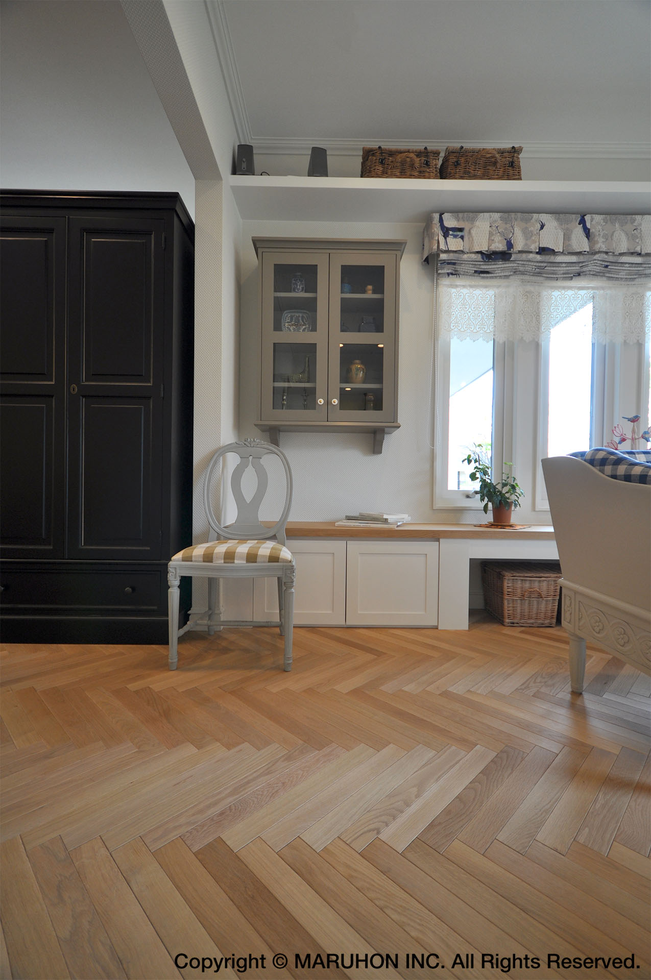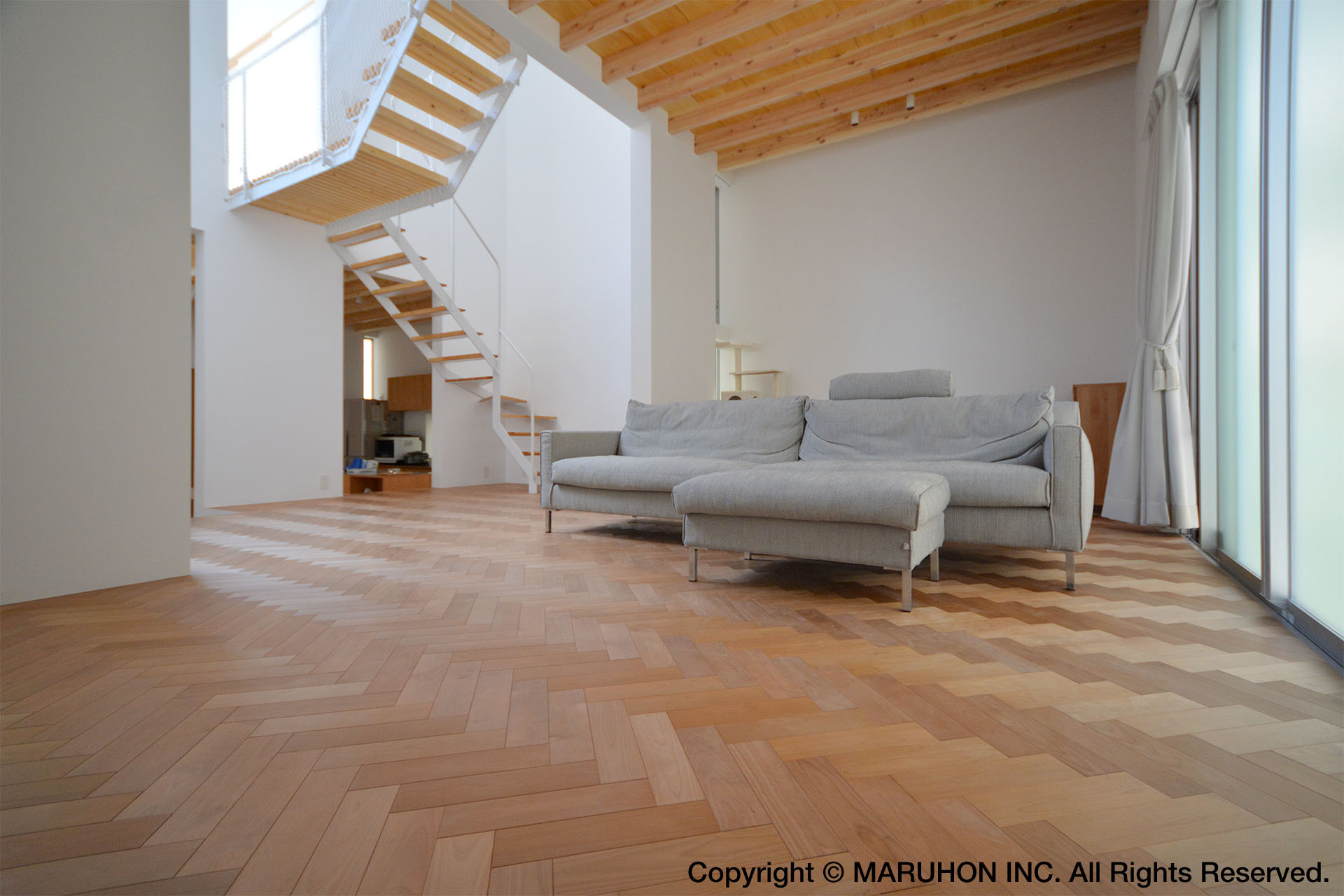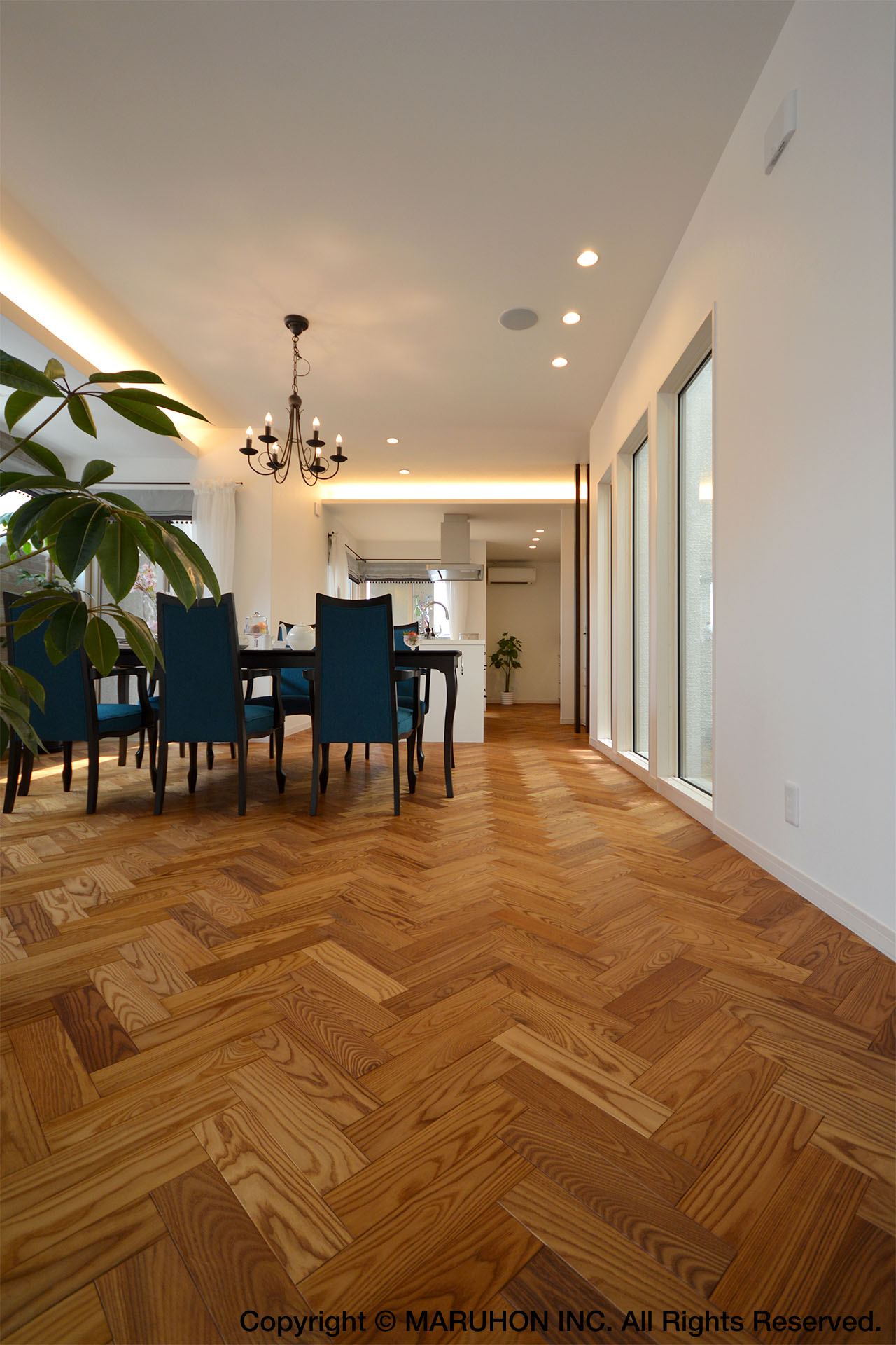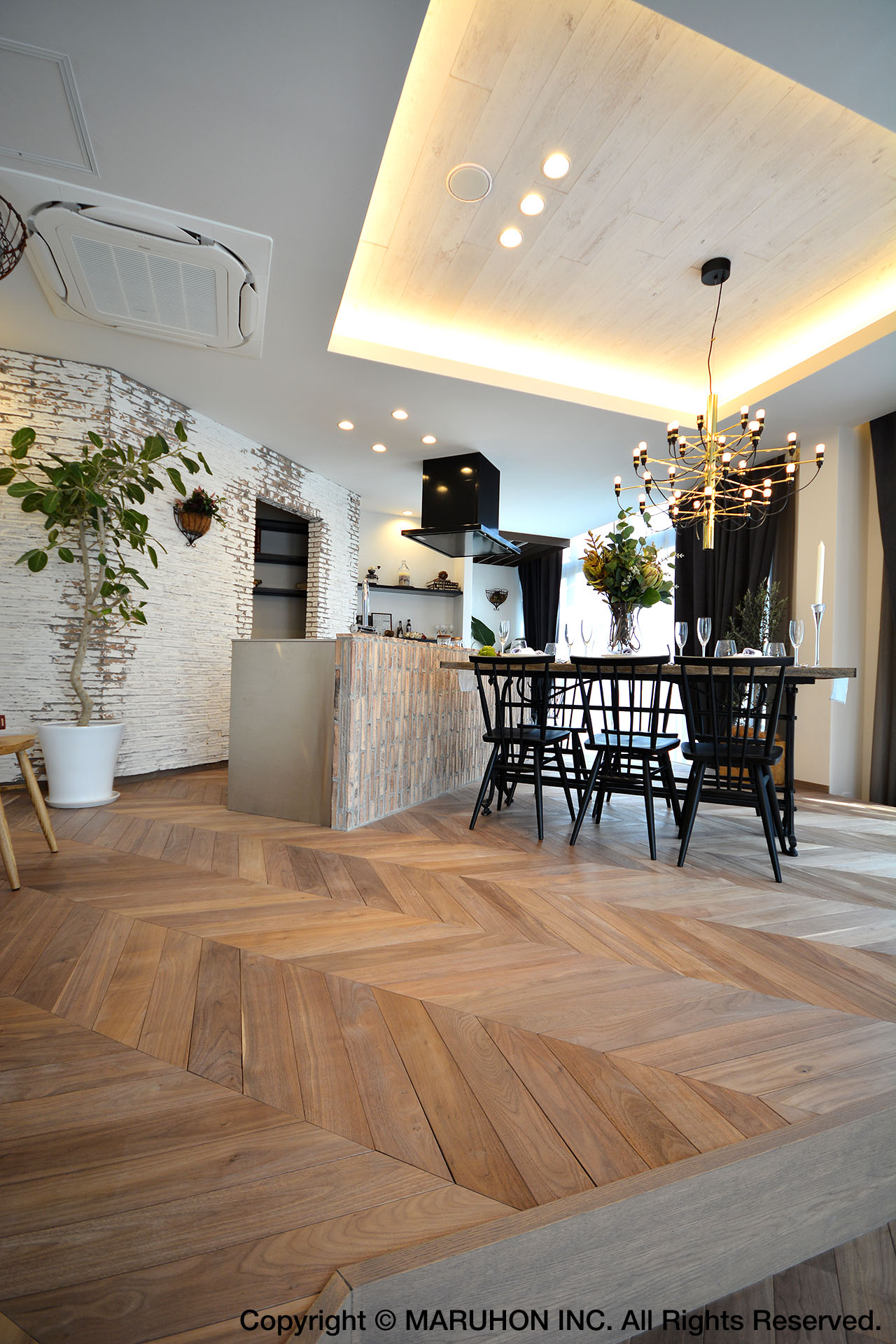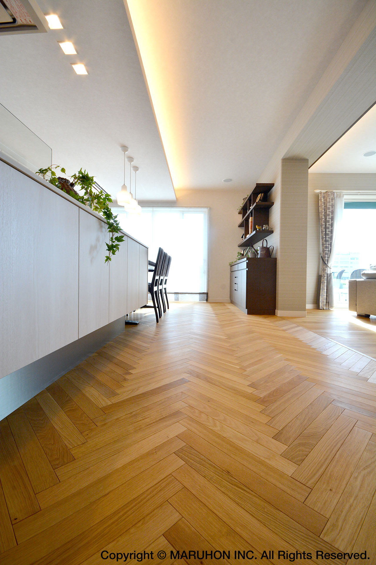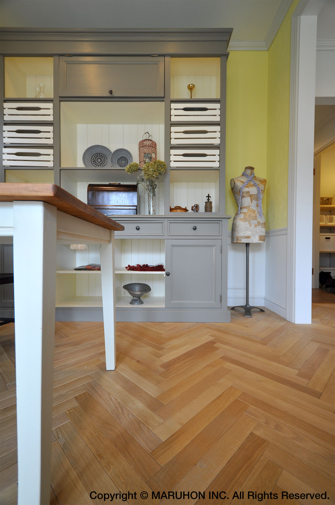 商品名ヨーロピアンオーク 床暖房対応 フレンチヘリンボーン 挽板フローリング 121.2mm巾 右用