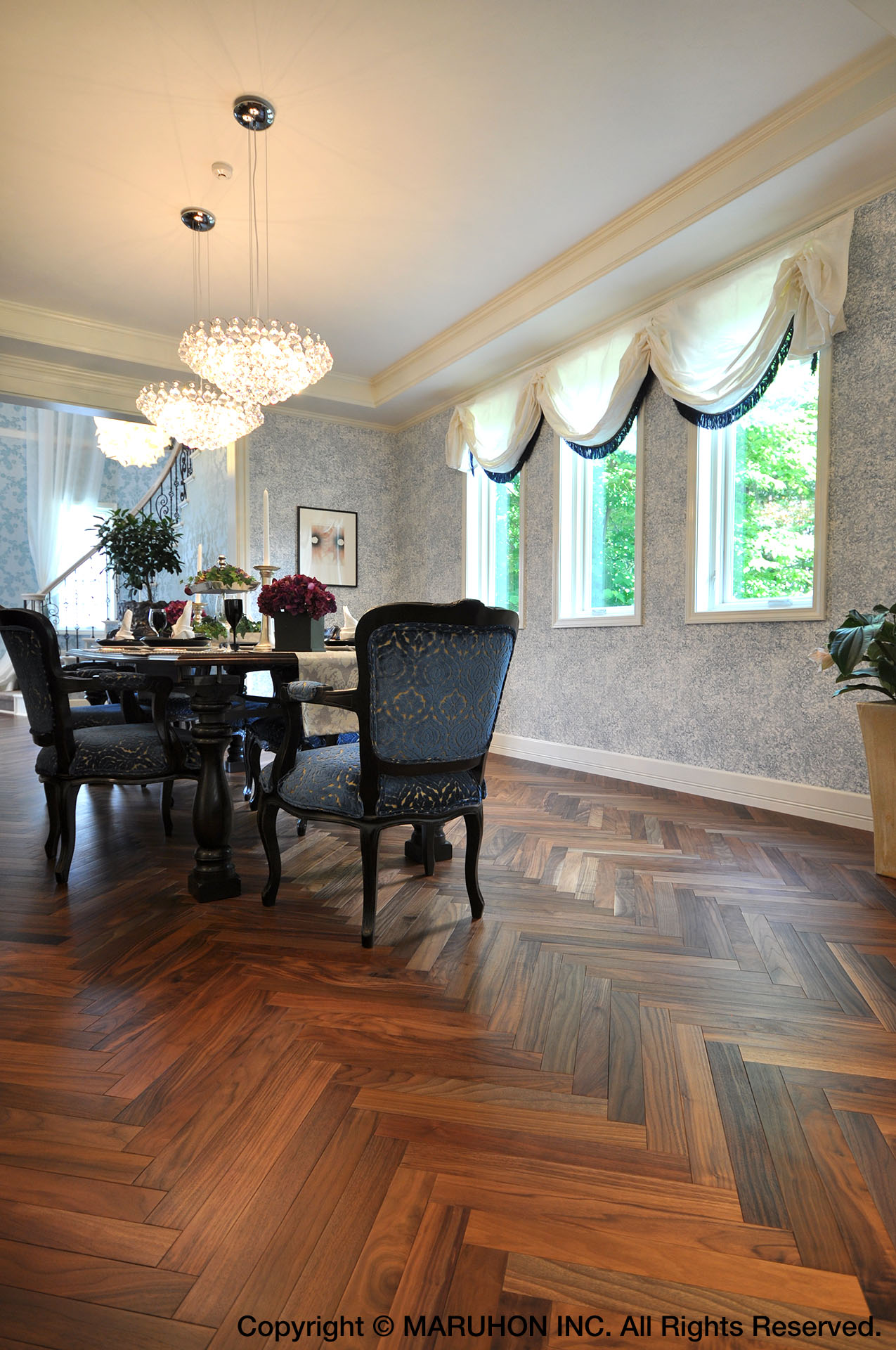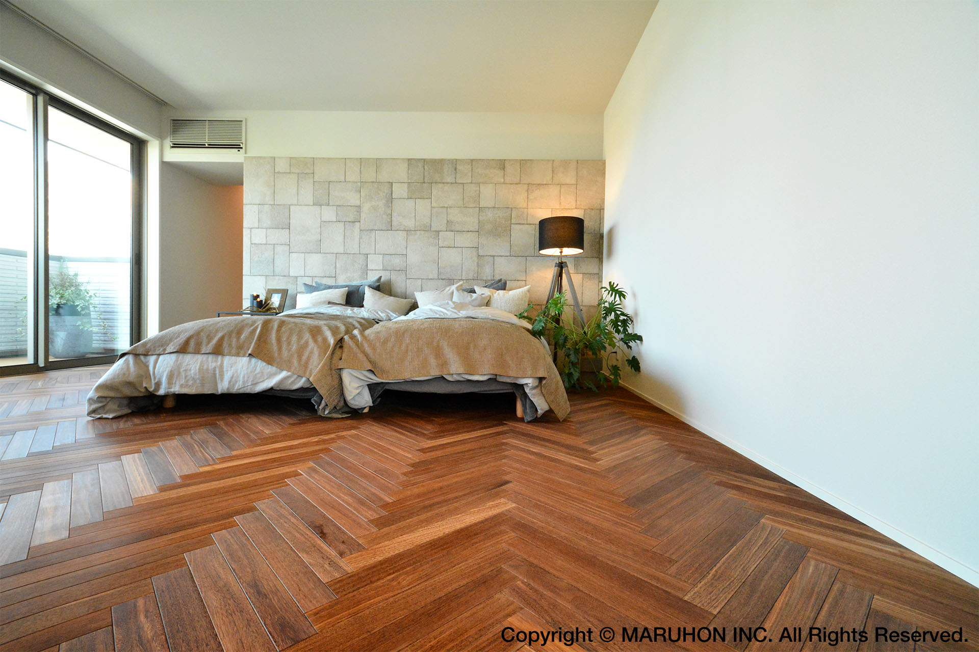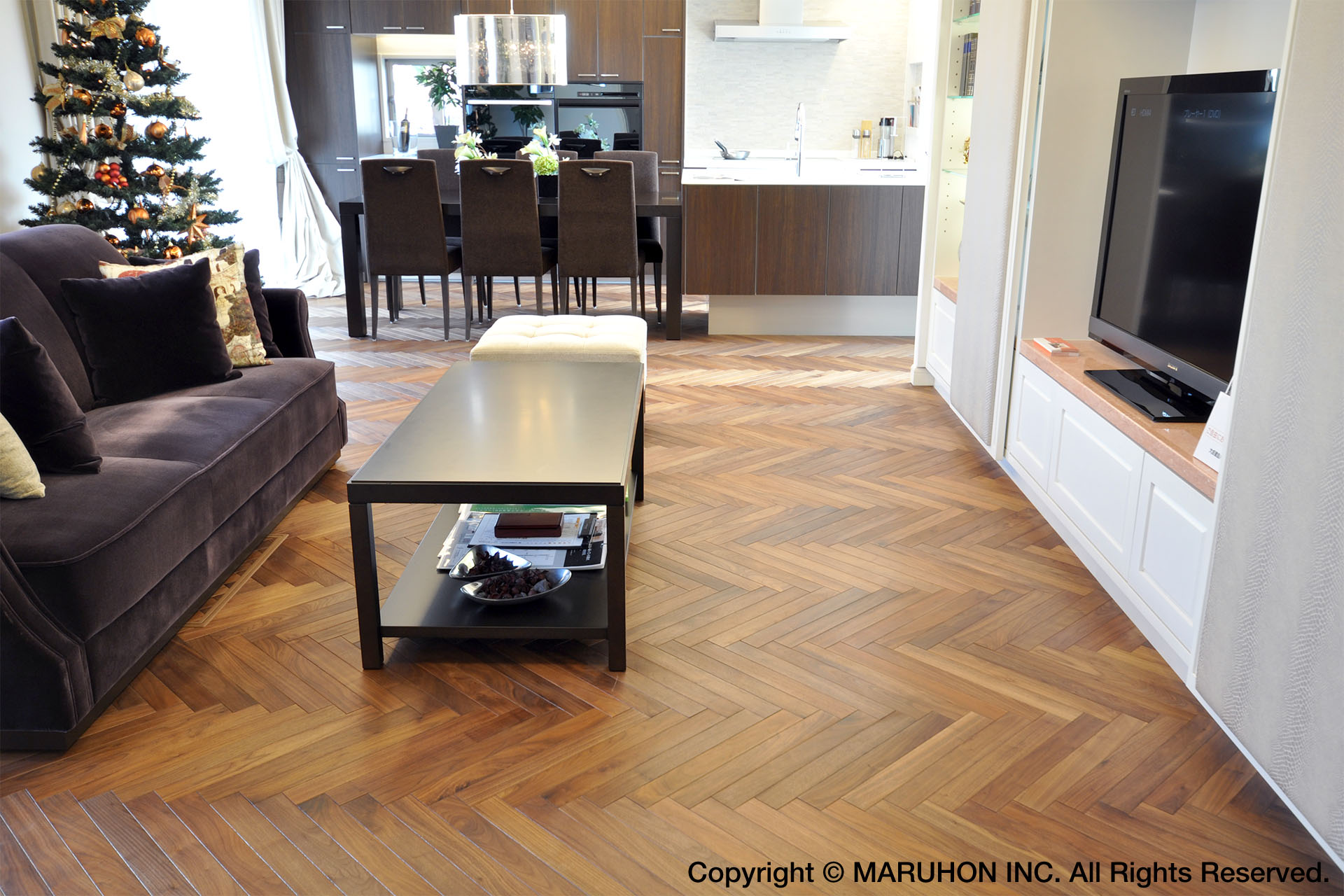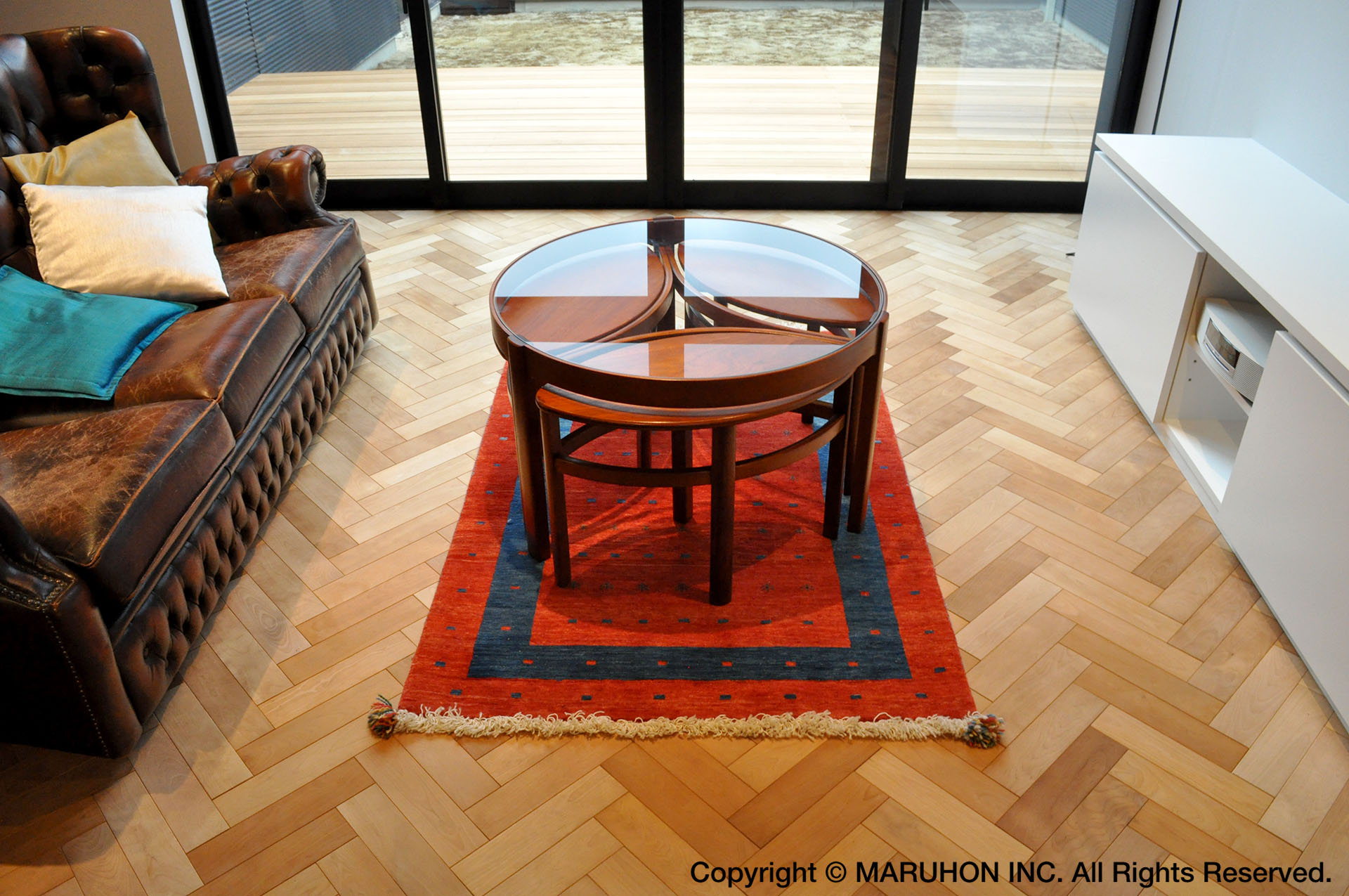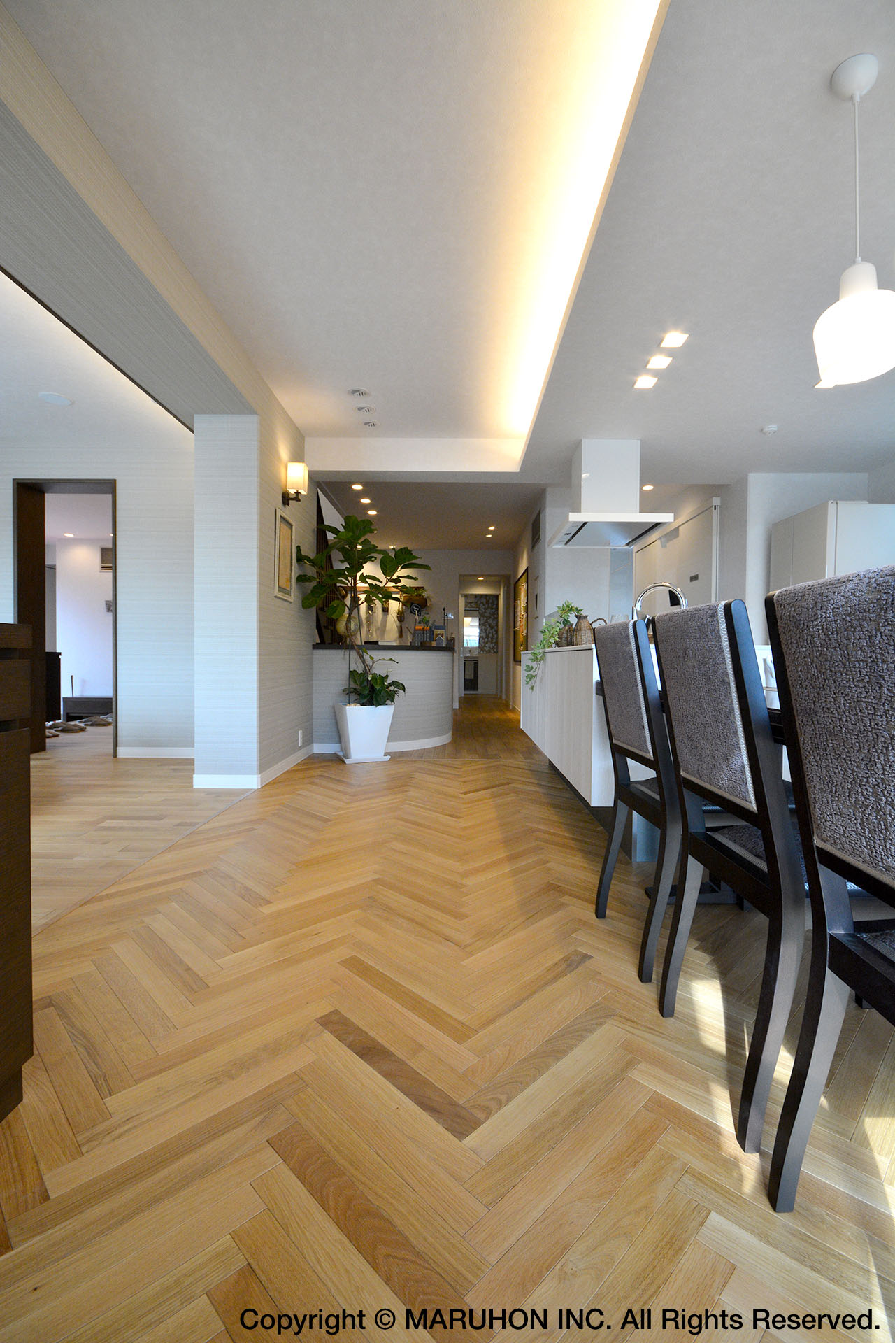 商品名ヨーロピアンオーク 床暖房対応 フレンチヘリンボーン 挽板フローリング 121.2mm巾 右用