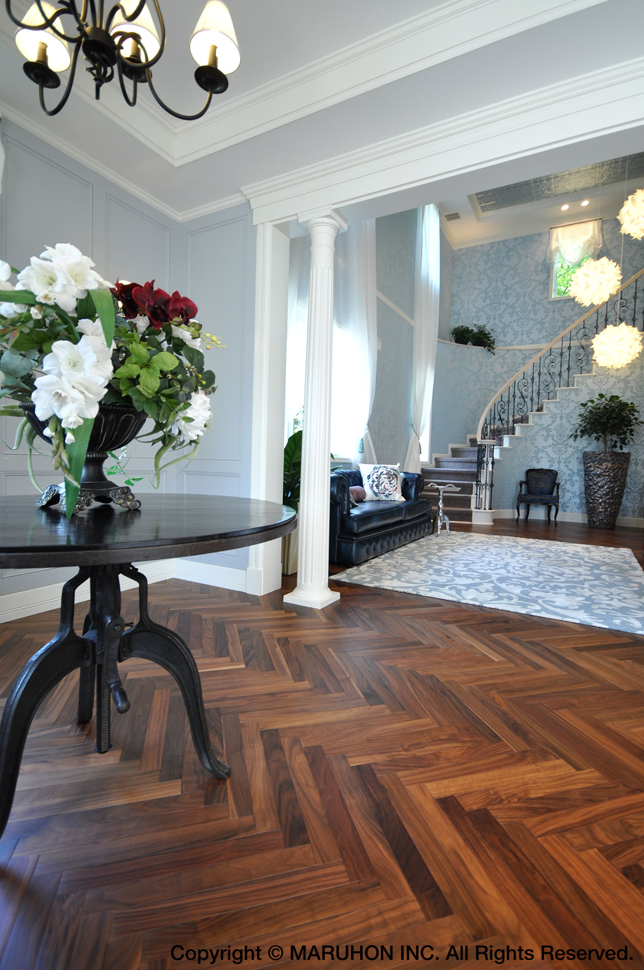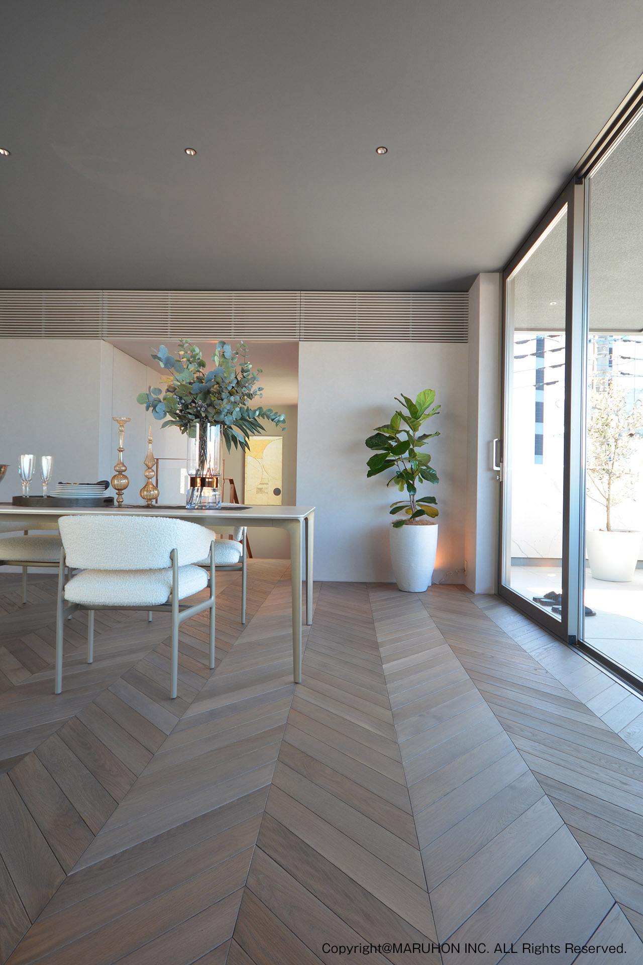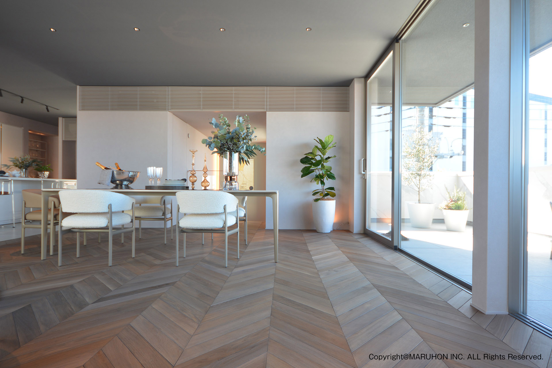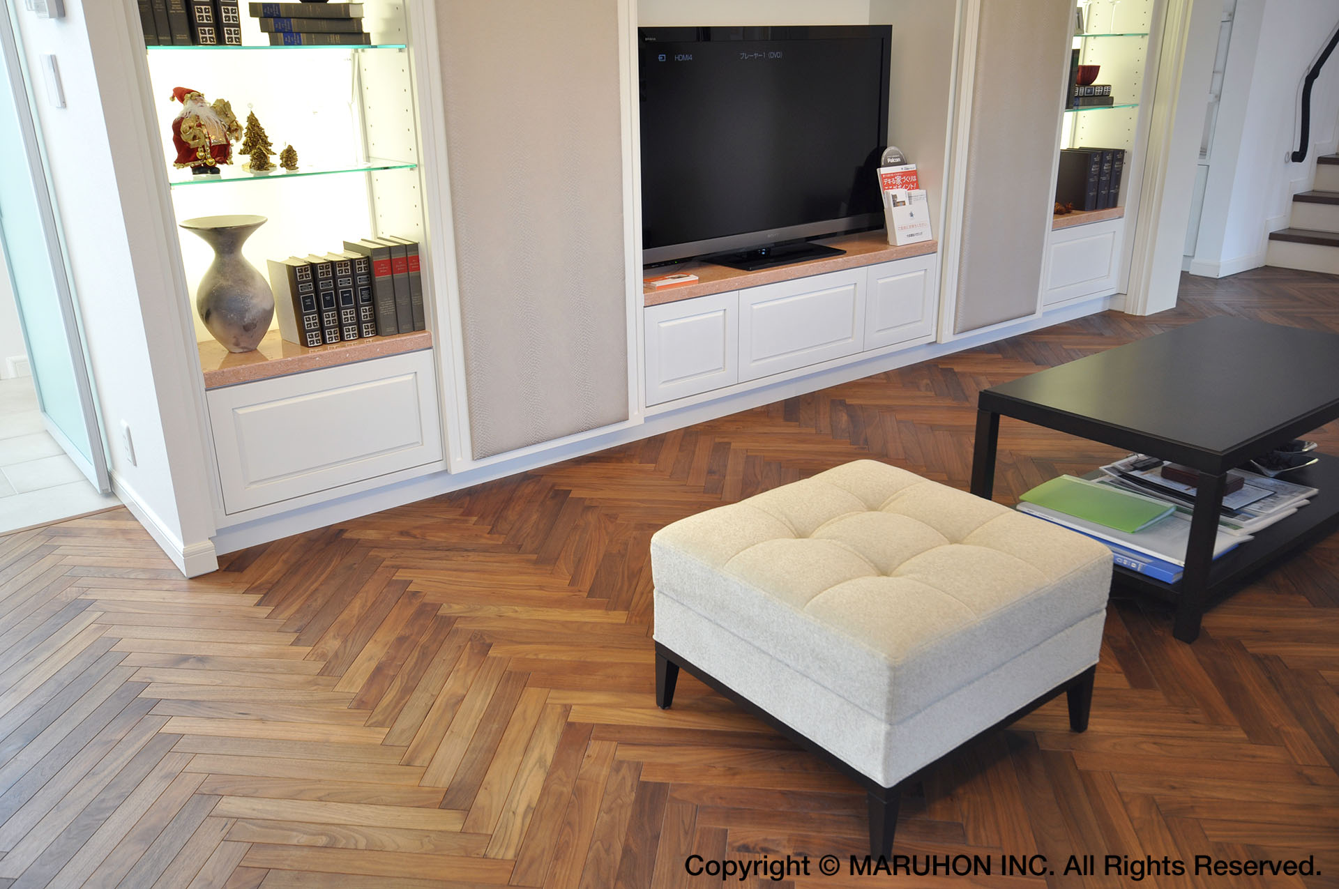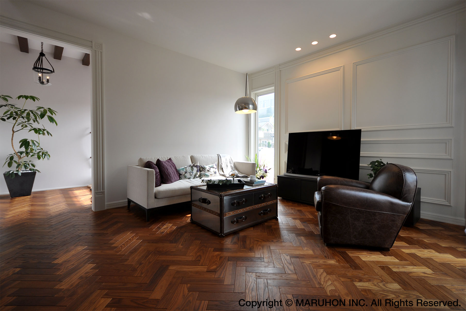 商品名ヨーロピアンオーク 床暖房対応 フレンチヘリンボーン 挽板フローリング 121.2mm巾 右用