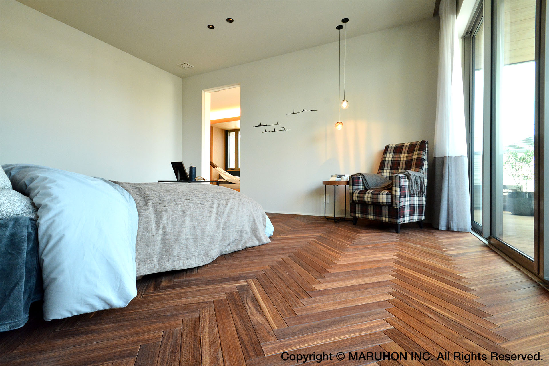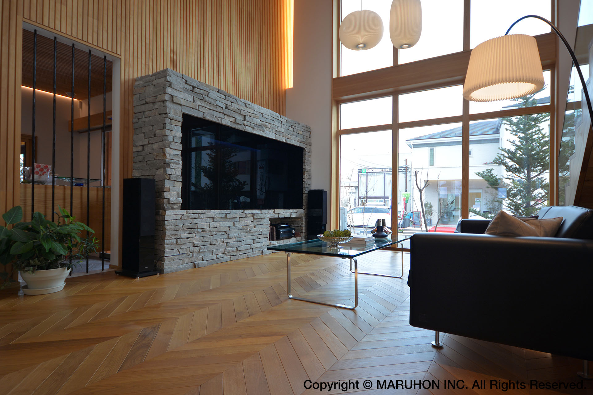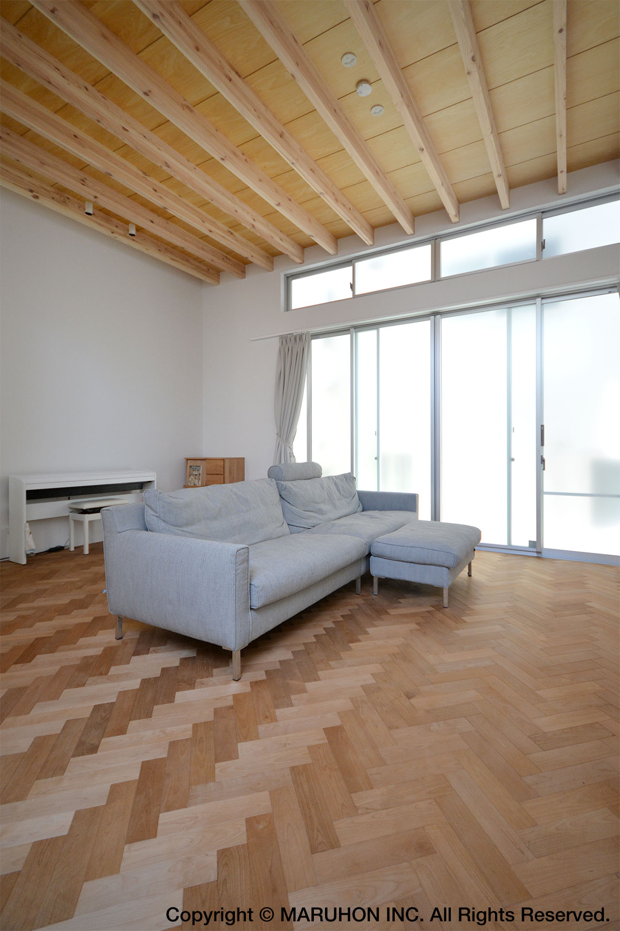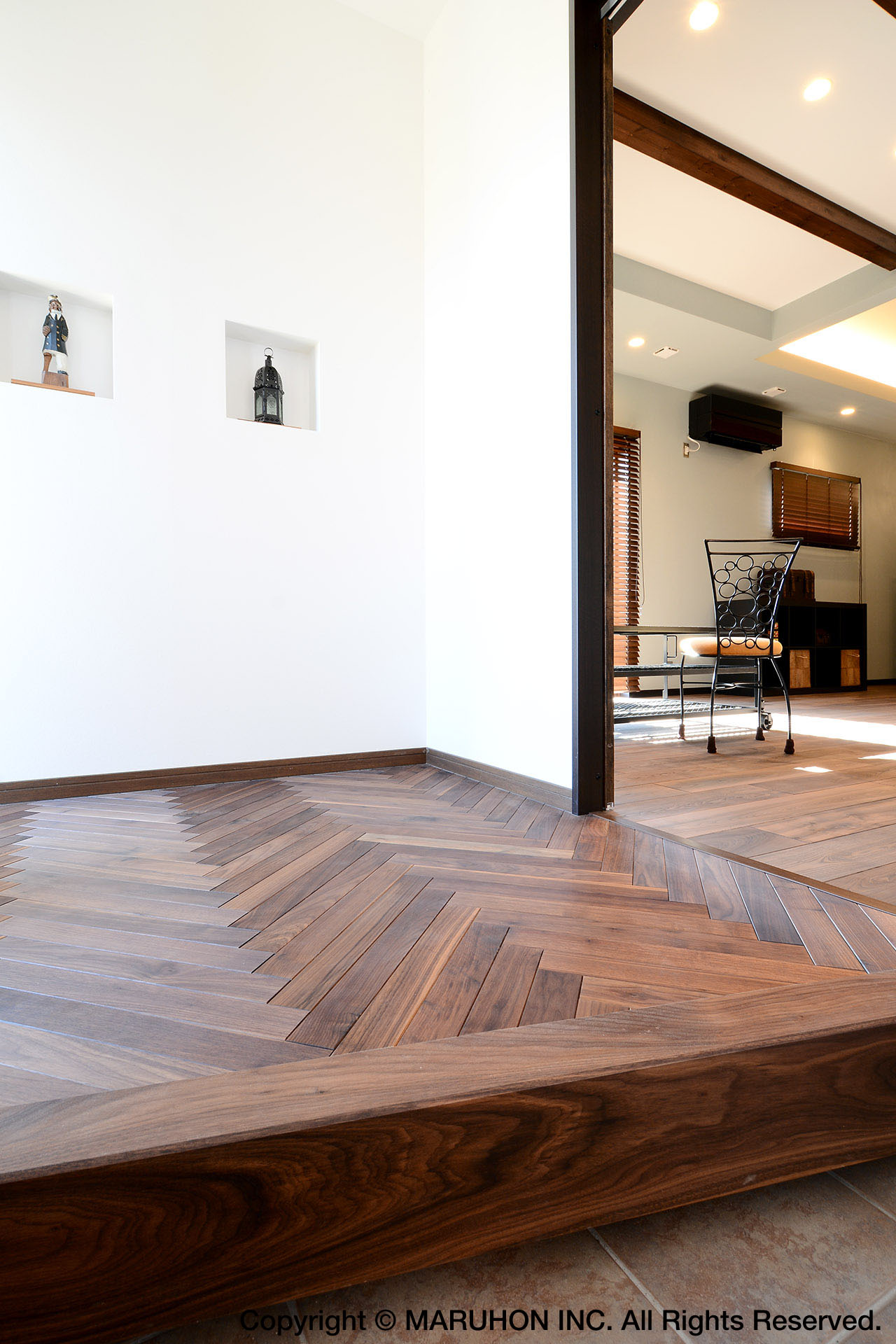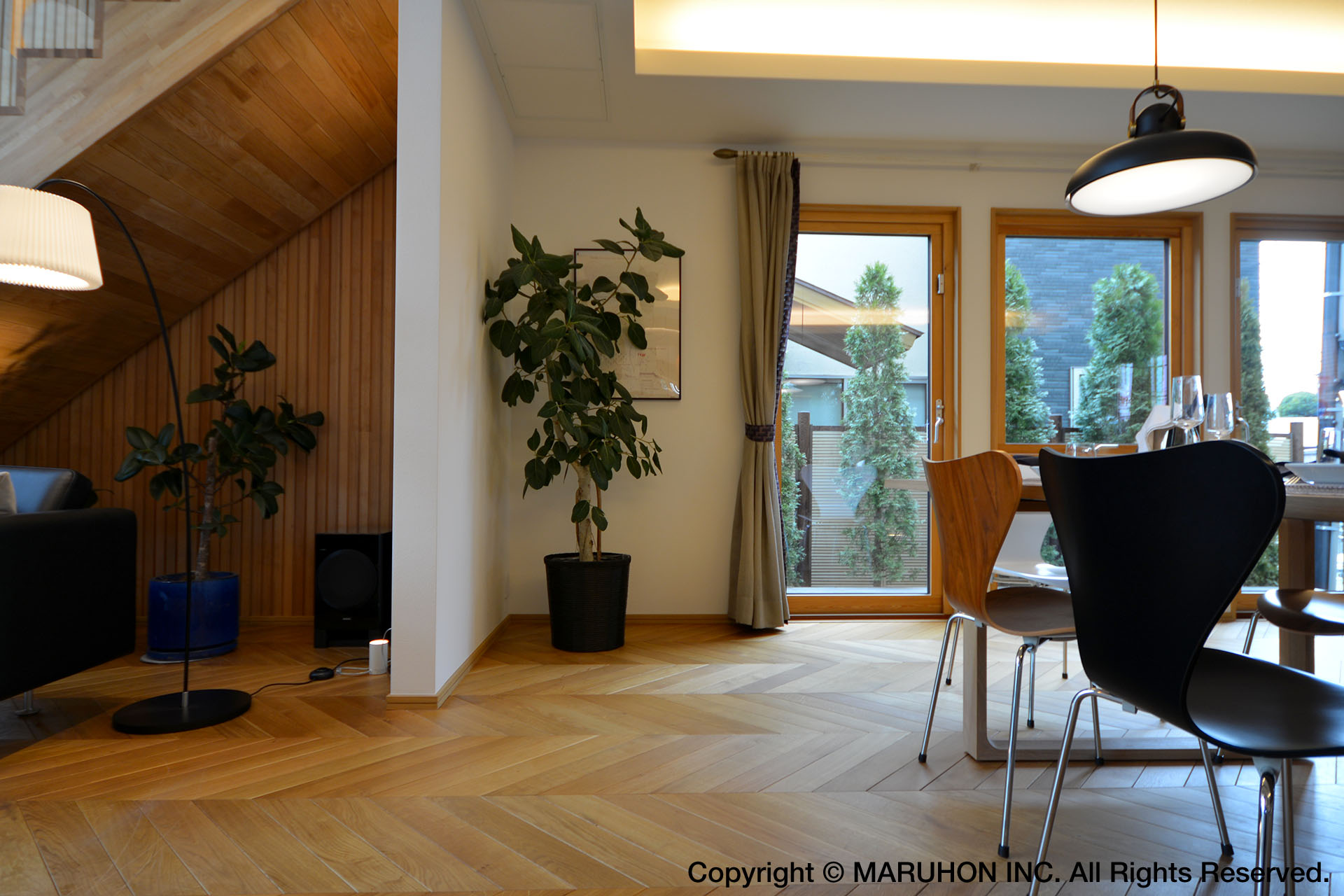 商品名ヨーロピアンオーク 床暖房対応 フレンチヘリンボーン 挽板フローリング 121.2mm巾 右用