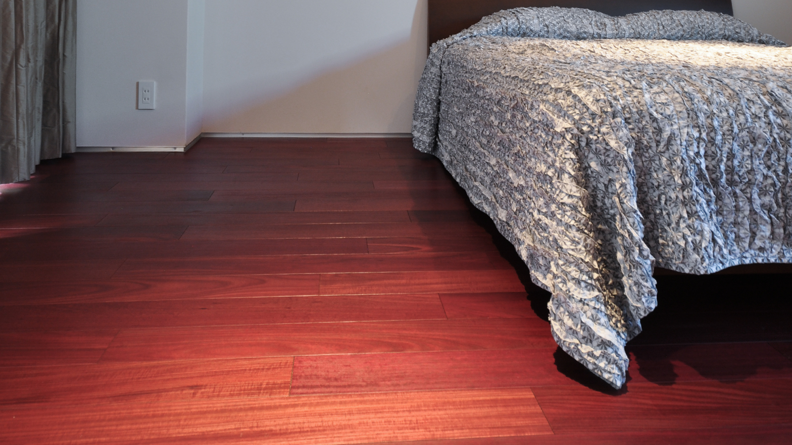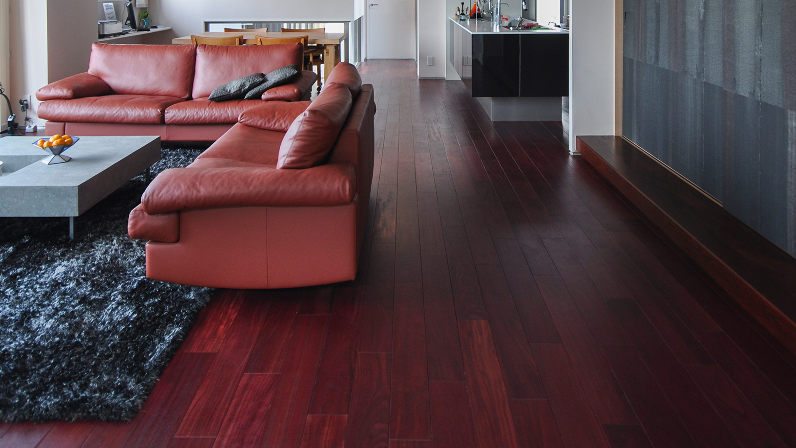 その鮮やかな色から、古くから寄木細工や象嵌などの工芸品に重宝されてきたパープルハート。表面装飾材として高い評価を得ていますが、木材としても優れており、内装材に適した特性を持っています。乾燥後の狂いはほとんどなく、寸法安定性が高いことからも、フローリングに向いている木材です。欧米では、トラックの荷台の床にも使われているように土足歩行にも耐え得る非常に堅い木で、住宅の床材だけではなく、店舗といった場所にもおすすめです。また気乾比重が0.86と大きく耐久性にも優れ、シロアリに強いという特徴からデッキ材としても使用されています。